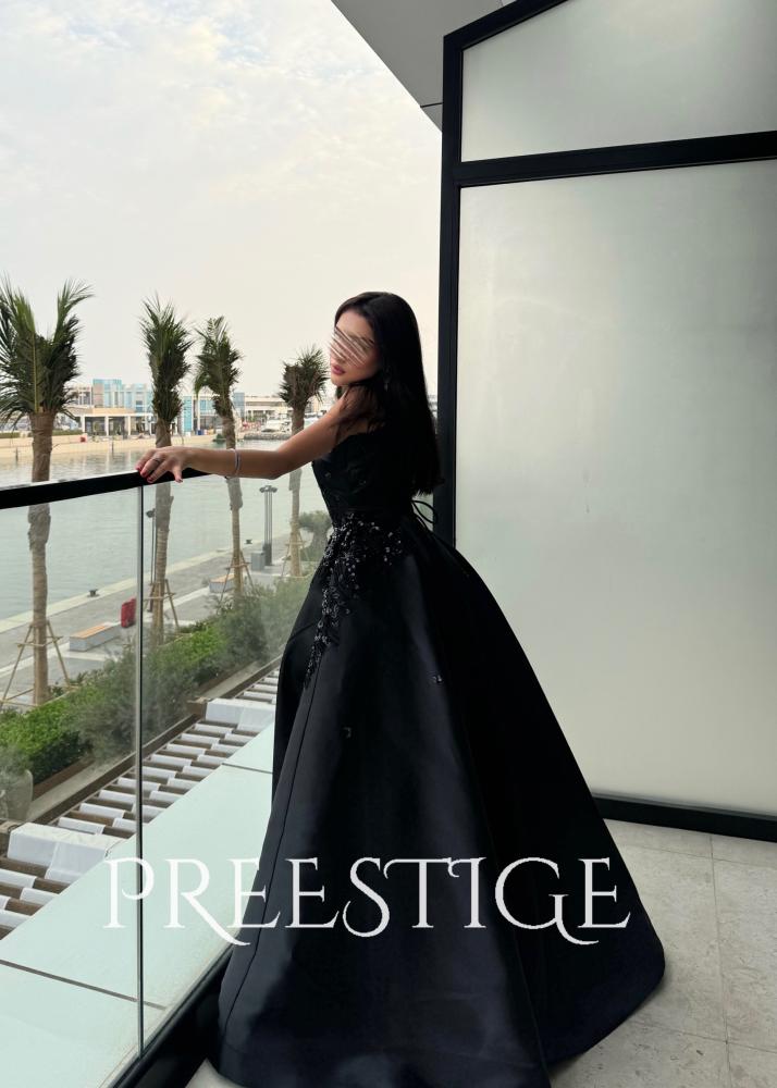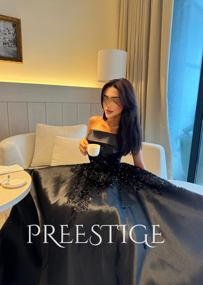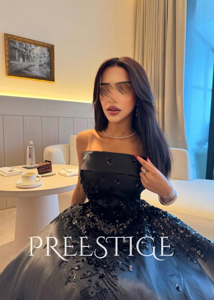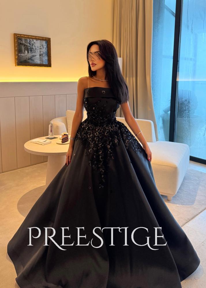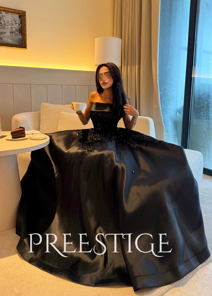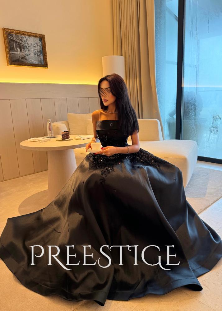 فستان الأنيقات في انتظارك .. فستان سهرة طويبل اسود صممه لكِ متجر برستيج من قماش الستان بقصة تنورة واسعة منفوشة باللون الأسود وقصة صدر ستربلس مزينة بتطريز كريستال يمتد للخصر، احصلي عليه الآن لإطلالة أجمل.