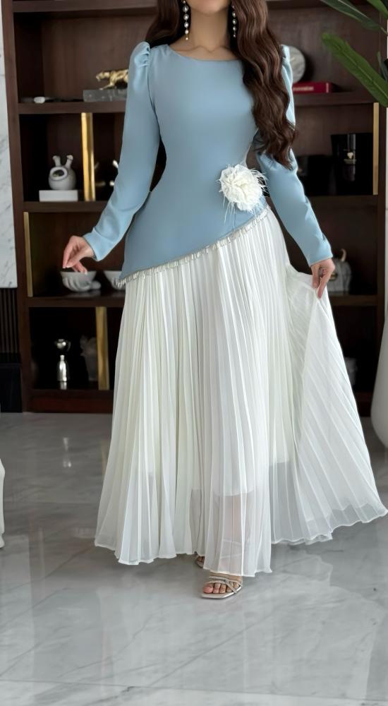 يأتي أجمل فستان كورينا باللون السماوي مع الأبيض، حتى تُبدين في كامل أناقتك في حفلاتك ومناسباتك التي تودين لحضورها، اكتشفي جمال فساتين السهرة مع هذا الفستان الراقي، وراقبي الأعين وهي تنظر إلى جمالك وتتساءل عن سر إطلالتك الفخمة والراقية.